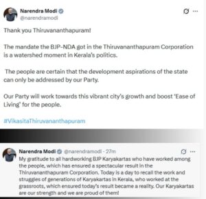 पीएम मोदी ने एक अन्य पोस्ट में कहा, “धन्यवाद तिरुवनंतपुरम! तिरुवनंतपुरम नगर निगम में भाजपा-NDA को मिला जनादेश केरल की राजनीति में एक ऐतिहासिक मोड़ है. लोगों को पूरा भरोसा है कि राज्य की विकास की आकांक्षाओं को सिर्फ हमारी पार्टी ही पूरा कर सकती है. हमारी पार्टी इस वाब्रेंट शहर के विकास के लिए पूरा काम करेगी और लोगों के लिए ईज ऑफ लिविंग को बेहतर बनाएगी