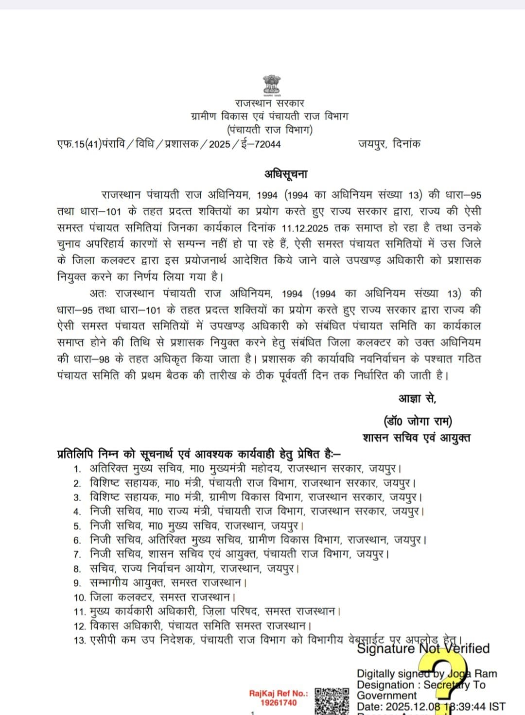 ग्रामीण विकास एवं पंचायती राज संस्थान की ओर से आदेश जारी किए गए हैं कि जिन पंचायतों का कार्यकाल 11 दिसंबर तक पूरा हो रहा है, वहां प्रशासनिक संचालन के लिए प्रशासक नियुक्त किए जाएंगे। इस व्यवस्था के तहत पंचायत समितियों में उपखंड अधिकारी यानी एसडीएम प्रशासक की जिम्मेदारी संभालेंगे।