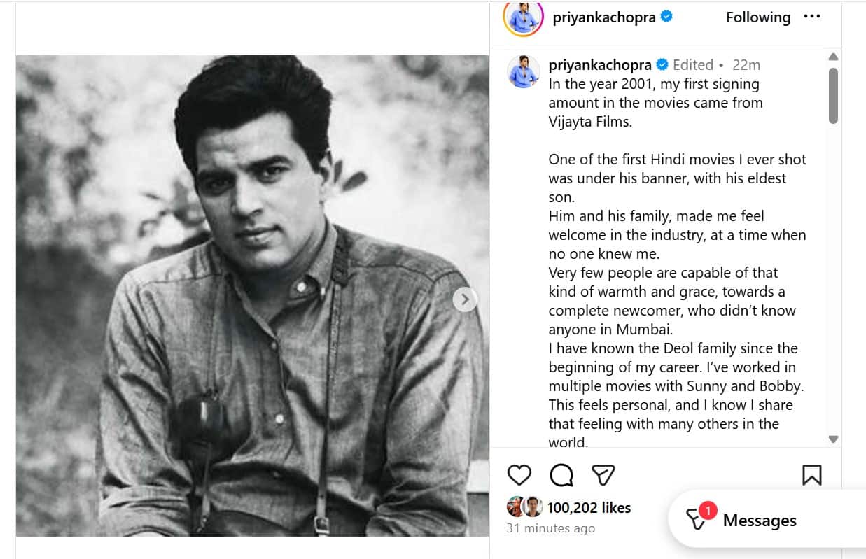 प्रियंका चोपड़ा ने लिखा, ‘कुछ लोग फिल्में छोड़ जाते हैं, कुछ अपने पीछे भावनाएं छोड़ जाते हैं. उन्होंने हमें दोनों ही चीजें दीं’. प्रियंका ने देओल परिवार को इस दुख की घड़ी में अपनी संवेदना जताई हैं