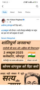 सरी तरफ सोनम वांगचुक के समर्थन में शांतिपूर्ण सभा, धरना और ज्ञापन देने का पोस्टर वायरल हो रहा है. सुरक्षा एजेंसियां अलर्ट हो गई हैं. सोशल मीडिया पर पोस्टर जारी होने के बाद सुरक्षा एजेंसियों के कान खड़े हो गए. पुलिस कमिश्नरेट में पुलिस अतिरिक्त सतर्कता बरत रही है. पुलिस फोर्स तैनात कर दिए गए हैं एडवोकेट किशन मेघवाल के सोशल मीडिया अकाउंट पर एक पोस्टर वायरल किया गया है, जिसमें 2 अक्टूबर गांधी जयंती पर दोपहर 1:00 बजे जिला कलेक्टर परिसर के बाहर अधिक से अधिक लोगों को एकत्रित होने का आह्वान किया गया है. यह शांतिपूर्ण सभा धरना और ज्ञापन लद्दाख में हिंसा के आरोपी सोनम वांगचुक के समर्थन में रखी गई है
